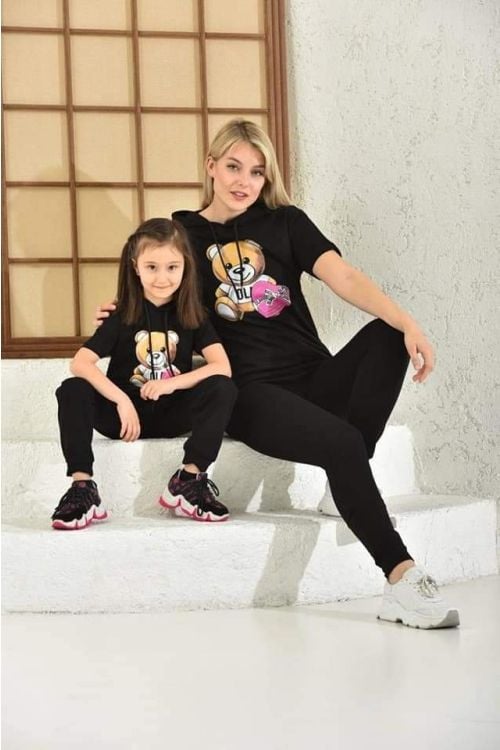 -Set Trening Fashimo sport format din trening dama si trening copil -Compoziţie : bumbac si lycra -Culoare : negru * Nuanta, tonul si intensitatea culorii pot varia in functie de monitor. -Masuri dama : S-bust 94 cm, talie 94 cm,sold 100 cm, lungime bluza 60 cm, lungime pantalon 96 cm; M- bust 98 cm, talie 98 cm, sold 102 cm, lungime bluza 63 cm, lungime pantalon 96 cm; L- bust 100 cm, talie 100 cm, sold 104 cm, lungime bluza 63 cm, lungime pantalon 98 cm; XL- bust 106 cm, talie 102 cm, sold 106 cm, lungime bluza 63 cm, lungime pantalon 99 cm. -Masuri copii: 5-6- talie 68 cm, lungime bluze 43 cm, lungime pantalon 65 cm; 7-8 -talie 72 cm, lungime bluza 44 cm, lungime pantalon 67 cm; 9-10- talie 78 cm, lungime bluza 46 cm, lungime pantalon 73 cm; 11-12- talie 80 cm, lungime bluza 49 cm, lungime pantalon 75 cm.