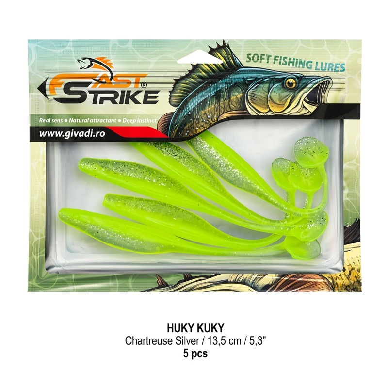 Fast Strike Huky Kuky 11,5cm, culoare Chartreuse Silver este o nălucă soft de înaltă calitate, proiectată pentru pescuitul șalăului, știucii, somnului și bibanului mare , oferind o acțiune extrem de atractivă și o versatilitate excelentă pe orice tip de apă — râuri, baraje sau lacuri. Corpul subțire, alungit, este completat de o coadă lungă și suplă , care generează vibrații fine și mișcări naturale chiar și la recuperări lente. Această acțiune realistă declanșează atacuri reflexe din partea răpitorilor, chiar și în perioadele de apatie. Huky Kuky 11,5cm poate fi folosită cu succes atât la trena , cât și armată pe jig , păstrând o evoluție echilibrată și eficientă. Materialul moale și elastic din care este fabricată asigură rezistență la multiple atacuri, fără pierderea formei sau a flexibilității. Năluca este impregnată cu miros atractiv de peștișor pradă , iar ambalajul premium, cu blister rigid și plic resigilabil cu fermoar , protejează forma și calitatea momelii în timpul transportului și depozitării. Caracteristici: ? Tip nălucă: shad soft alungit ? Specii vizate: șalău, știucă, somn, biban mare ⚙️ Material: silicon premium, moale și rezistent ? Coada: lungă, vibrație amplă și naturală ? Aromă: miros atractiv de peștișor pradă Monturi compatibile: jig, trena, offset ? Culoare: Chartreuse Silver ? Lungime: 11,5 cm (4.5) ⚖️ Greutate: 4.3 g ? Ambalaj: blister cu tavă rigidă, plic cu fermoar, 10 bucăți