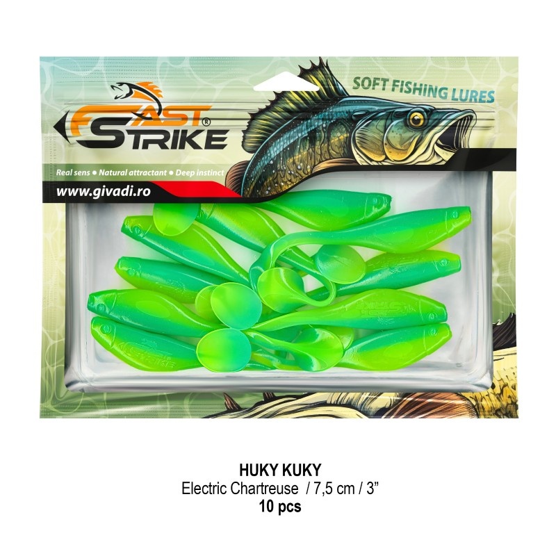 Fast Strike Huky Kuky Electric Chartreuse 7,5 cm este o nălucă soft extrem de atractivă , concepută pentru pescuitul la rapitori precum șalău, știucă, biban sau avat . Forma unică a corpului și coada lungă, subțire , oferă o vibrație intensă și naturală în timpul recuperării, provocând atacul chiar și al peștilor apatici. Momeala este eficientă atât la trena, cât și armată pe jig , fiind potrivită pentru ape curgătoare, lacuri și baraje . Materialul premium, moale dar rezistent , asigură o evoluție realistă și o durată lungă de utilizare, chiar și după multiple atacuri. Nalucile Huky Kuky sunt impregnate cu miros atractiv și sunt ambalate în pungi cu fermoar și tavite rigide , pentru a păstra forma perfectă a corpului și flexibilitatea în timp. Fiecare momeală are logo-ul Fast Strike turnat , garanție a originalității și calității superioare. ⭐ Caracteristici: ? Tip momeală: nălucă soft ? Model: Fast Strike Huky Kuky ? Dimensiune: 7,5 cm ? Specii vizate: șalău, știucă, biban, avat ? Coada lungă și subțire – vibrație naturală, mișcări irezistibile ? Eficientă la trena și pe jig ? Material premium – moale, elastic și durabil ? Rezistent la raze UV , vegetație și obstacole submerse ? Pigmenți speciali – reflexii naturale pe toată durata zilei ? Impregnată cu miros atractiv ? Ambalare: blister cu fermoar + tavă rigidă ? Culoare: Electric Chartreuse ? Conținut: 10 bucăți/blister ✅ Logo Fast Strike imprimat pe fiecare momeală