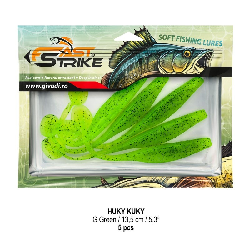 Shad Fast Strike Huky Kuky, G Green, 13.5cm, 5buc/blister este o nălucă soft premium, dedicată pescuitului peștilor răpitori precum știuca, șalăul, somnul și bibanul mare , având o acțiune irezistibilă și o construcție atent gândită pentru performanță maximă. Corpul alungit, suplu și coada lungă, subțire, conferă nalucii o mișcare naturală și o vibrație amplă care atrage răpitorii chiar și în perioadele de activitate redusă. Datorită formei sale, Huky Kuky poate fi folosită cu succes atât la trena , cât și armată pe jig , evoluând stabil și provocator în toate straturile de apă — de la suprafață la adâncime. Realizată din material siliconic premium , moale dar rezistent, naluca își păstrează proprietățile inițiale chiar și după multiple atacuri. Este impregnată cu un miros atractiv de peștișor pradă, menit să prelungească timpul de interes al răpitorului. Ambalată în blister rigid cu tavă de protecție și plic resigilabil cu fermoar , Huky Kuky 13.5cm își păstrează forma perfectă și calitatea materialului în timp, fiind o alegere de încredere pentru pescarii exigenți. Caracteristici: ? Tip nălucă: shad soft alungit ? Specii vizate: știucă, șalău, somn, biban mare ⚙️ Material: silicon premium, moale și durabil ? Coada: lungă și flexibilă, vibrație amplă și realistă ? Aromă: peștișor pradă, impregnată din fabrică Monturi compatibile: jig, trena, offset ? Culoare: G Green ? Lungime: 13.5 cm ⚖️ Greutate: 8.4 g ? Ambalaj: blister cu tavă rigidă și plic resigilabil, 5 bucăți