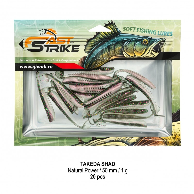 Fast Strike Takeda Shad 5 cm / 1 g este o nălucă soft extrem de atractivă , concepută special pentru pescuitul la rapitori precum biban, șalău, știucă sau avat. Forma corpului, împreună cu coada supradimensionată de tip paletă , generează o vibrație intensă și mișcări irezistibile , care provoacă atacul chiar și în cele mai dificile condiții. Striațiile de pe burtă produc o oscilație naturală , imitând perfect peștii pradă, iar la mici impulsuri din vârful lansetei, naluca eliberează bule fine de aer , un detaliu care păcălește inclusiv cei mai suspicioși rapitori. Realizate dintr-o mixtură specială de silicon moale , shad-urile sunt rezistente la razele UV, la vegetație și la contactul cu pietriș sau crengi submerse. Sunt impregnate cu miros atractiv și ambalate în plic cu fermoar + tavă rigidă , pentru a-și păstra forma perfectă în timp. ⭐ Caracteristici: ? Tip nălucă: shad soft ? Model: Fast Strike Takeda Shad ? Lungime: 5cm ⚖️ Greutate: 1g ? Coada de tip paletă – vibrație intensă și atractivă ? Striații pe burtă – imitație realistă + eliberare de bule de aer ? Material: silicon moale, flexibil, rezistent la UV ? Aroma: miros atractiv pentru rapitori ? Culoare: Natural Power 25 ? Ambalaj: 20 buc / plic ? Ideală pentru biban, șalău, știucă, avat