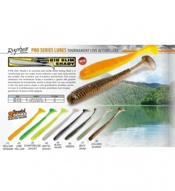 Descriere: RIB Slim Shady este o versiune mai subtire a seriei Swing Shad de la Rapture. Datorita corpului sau subtire, coada se va agita cu orice miscare usoara a varfului tijei. Poate fi folosit cu Texas sau Carolina Rigs si, datorita flexibilitatii sale, ofera performante excelente si atunci cand este folosit in stilul drop shot. Acest shad este atat de versatil incat poate fi folosit pe un cap de jig si folosit la pescuitul bibanului chiar si pe ape sarate. Caracteristici: - Model: RIB Slim Shady - Culoare: Black Silver - Lungime: 7.5cm - Mod ambalare: 12buc/plic - Shad cu evolutie naturala - Specii vizate: salau, biban sau stiuca Producator: Rapture