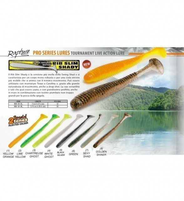 Descriere: RIB Slim Shady este o versiune mai subtire a seriei Swing Shad de la Rapture. Datorita corpului sau subtire, coada se va agita cu orice miscare usoara a varfului tijei. Poate fi folosit cu Texas sau Carolina Rigs si, datorita flexibilitatii sale, ofera performante excelente si atunci cand este folosit in stilul drop shot. Acest shad este atat de versatil incat poate fi folosit pe un cap de jig si folosit la pescuitul bibanului chiar si pe ape sarate. Caracteristici: - Model: RIB Slim Shady - Culoare: White Ghost - Lungime: 7.5cm - Mod ambalare: 12buc/plic - Shad cu evolutie naturala - Specii vizate: salau, biban sau stiuca Producator: Rapture