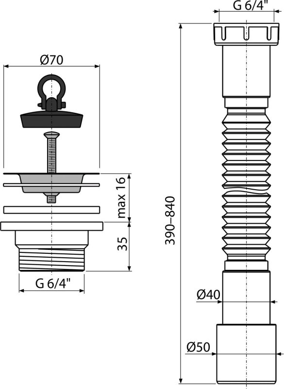 Aplicabilitate: Pentru conectarea la sistemul de canalizare Caracteristici / Specificatii Tehnice: Conexiune Ø6/4×40/50 mm Lungime reglabilă între 390–840 mm Dimensiunea filetului pentru racordarea sifonului 6/4 Material: polipropilenă Furtun flexibil Piuliță de plastic 6/4 Garnitură Suport pentru țevi flexibile Descarcari: