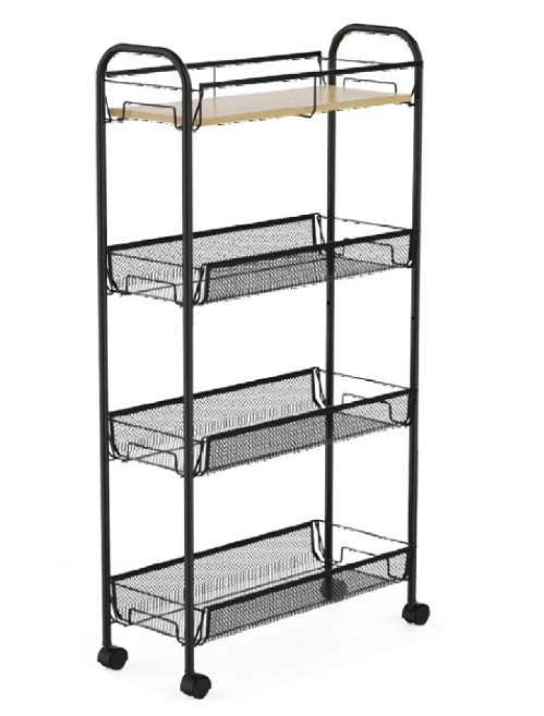 Caracteristicile produsului: 1. Polita din MDF - al 4-lea nivel este dotat cu 1 polita confectionata din MDF. 2. Capacitate mare de depozitare - poate acomoda condimente, snackuri, produse alimentare, diverse articole pentru baie si/sau bucatarie etc. 3. Structura solida - stabilitatea sporita este asigurata de cadrul suportului confectionat din metal, 3 rafturi metalice si de blatul din MDF. 4. Perfect pentru spatii inguste - dimensiunile raftului de 42 (L) x 26 (l) x 83 (H) cm permit ca acesta sa poata fi depozitat in spatii inguste, care in mod normal raman nefolosite. 5. Mobilitate - raftul poate fi usor transportat datorita celor 4 rotite rotative 360°. Doua dintre rotite sunt dotate cu functie de franare. 6. Design modern - se integreaza cu usurinta cu decorul casei. 7. Greutate maxima suportata - 5 kg per raft. 8. Dimensiune intre cosuri - 22 cm. 9. Greutate neta: 2.2 kg.