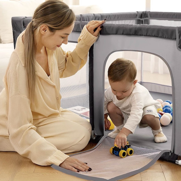 Tarc pentru bebelusi, activitati si manere Dimensiune produs: 127x127x69 cm Tarc pentru bebelusi, care reprezinta „lumea” ideala si sigura pentru copilul dumneavoastra, oferind spatiul necesar pentru joaca si explorare, in timp ce le ofera parintilor linistea de care au nevoie. Creati un spatiu de joaca complet controlat si sigur in interiorul casei! Acest tarc spatios este conceput pentru a incuraja independenta copilului, oferindu-i propriul spatiu pentru tarat, joaca cu mingile si pentru a face primii pasi in siguranta. Se remarca prin faptul ca este realizat din materiale de calitate superioara, cu structura din teava metalica rezistenta si acoperire din material Oxford 210D de inalta calitate. Dispune de 8 ventuze puternice la baza, care se fixeaza pe podea si impiedica deplasarea sau rasturnarea tarcului in urma miscarilor bebelusului. Peretii laterali din plasa permit copilului sa va vada in permanenta (oferind un sentiment de siguranta) si asigura o circulatie optima a aerului. Este prevazut cu fermoar exterior pentru acces facil, permitand intrarea si iesirea copilului doar atunci cand doriti, si include 2 manere de sustinere (rings) care ajuta bebelusul sa se ridice in picioare si sa isi exerseze echilibrul. Este livrat cu geanta de transport. Umpleti-l cu mingi colorate pentru a-l transforma in locul de joaca ideal pentru copii. Dimensiuni ambalaj 60x24x20 cm Lungime x Latime x Inaltime 127x127x69 cm Varsta recomandata 6 - 36 Luni