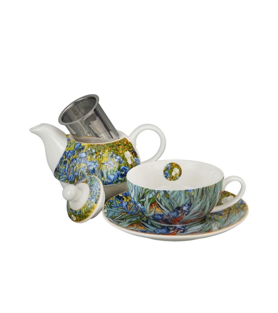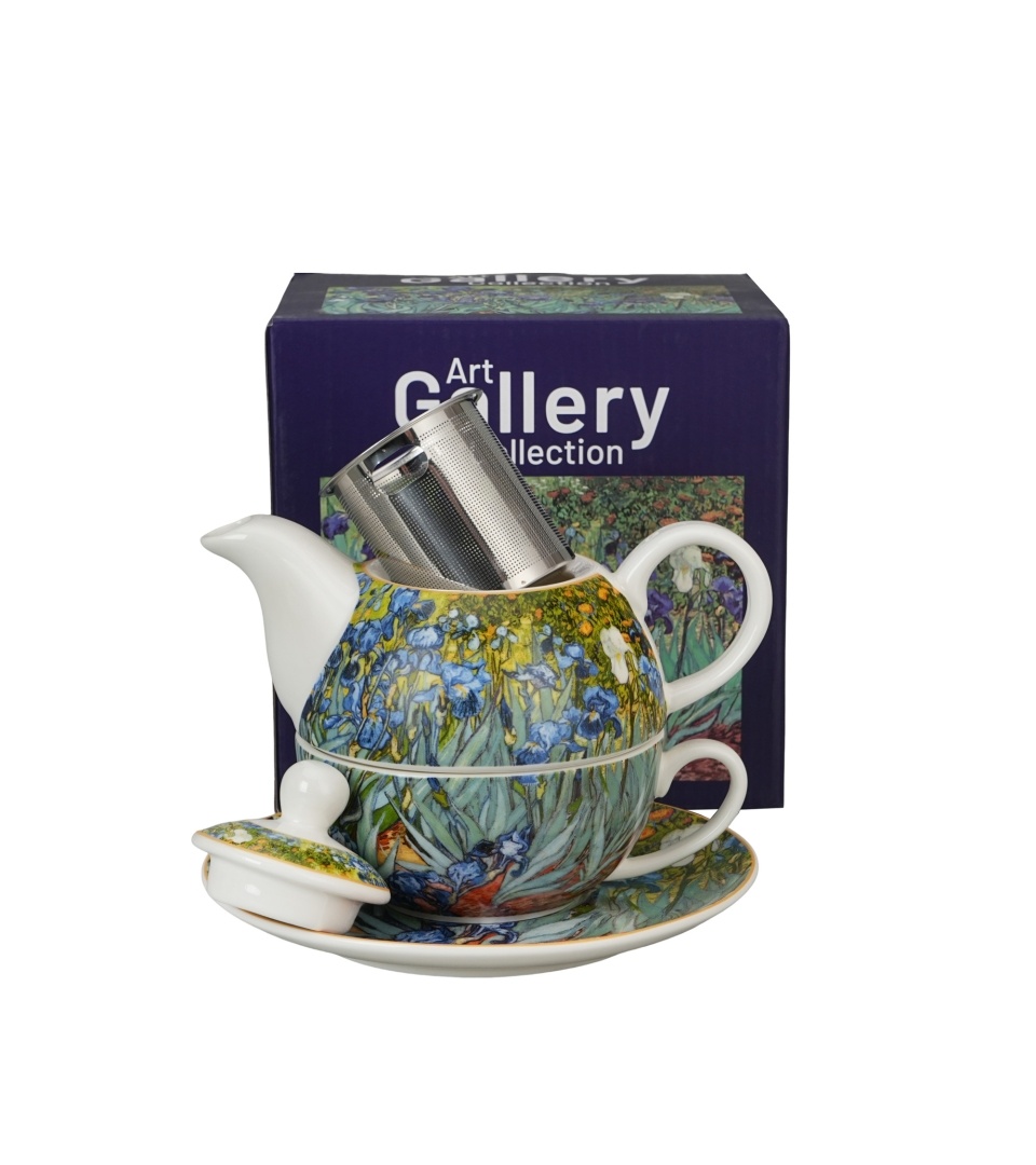 Acest set Tea for One din portelan este conceput pentru prepararea si servirea ceaiului intr-o portie individuala, intr-un format compact si usor de folosit. Include ceainic de 350 ml cu capac, ceasca de 300 ml, farfurioara si infuzor metalic, toate gandite sa functioneze impreuna intr-un ansamblu practic, potrivit pentru cei care prefera ceaiul vrac si vor un set complet, fara accesorii separate. Infuzorul metalic se aseaza in ceainic si permite prepararea directa a ceaiului, iar dupa infuzare bautura poate fi turnata simplu in ceasca din set. Ceainicul se suprapune peste ceasca, iar farfurioara completeaza servirea intr-un mod ordonat si compact. Este un tip de set tea for one potrivit pentru acasa, pentru birou sau pentru momentele in care vrei sa iti pregatesti ceaiul doar pentru tine, fara sa folosesti un serviciu mai mare. In cautari online, produsul se potriveste natural in categorii precum tea for one, set ceai cu infuzor, ceainic cu ceasca si farfurioara sau set portelan pentru ceai vrac. Decorul este inspirat de Irises, una dintre lucrarile asociate lui Vincent van Gogh. Pe ceainic, ceasca, capac si farfurioara apar nuante intense de albastru, verde, galben si accente calde de rosu, intr-o compozitie florala recognoscibila si expresiva. Modelul acopera generos piesele si transforma setul intr-un obiect care iese imediat in evidenta, fara sa piarda din utilitatea lui de zi cu zi. Este un produs potrivit pentru cei care apreciaza ceaiul, dar si pentru cei care cauta obiecte de servire cu decor artistic clar. Punctul lui forte este combinatia dintre functionalitate si imagine: un set complet pentru ceai individual, cu infuzor inclus si cu un decor inspirat dintr-o lucrare foarte cunoscuta, prezentat in cutie din seria Art Gallery Collection.
