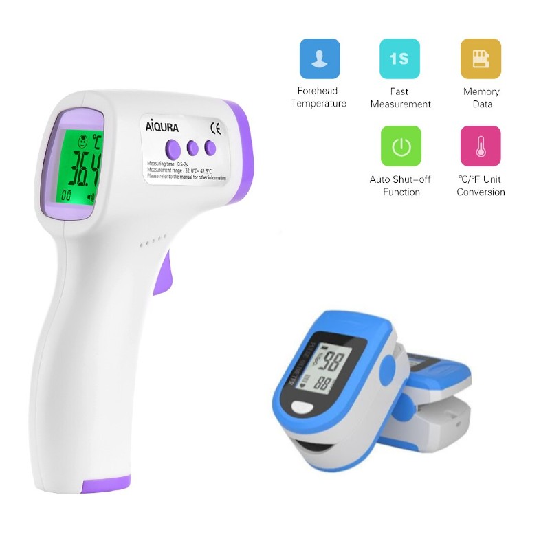 Termometru frontal noncontact + Aparat Pulsoximetru Termometrul frontal profesional cu infrarosu masoara temperatura artelei frontale a corpului uman, fiind cadoul ideal pentru orice familie. Acesta masoara temperatura corpului frontal, non-contact, de la distanta cuprinsa intre 5-15 cm. Un cadou util pentru orice membru al familiei, in special pentru copii care nu au rabdare sa li se masoare temperatura cu termometrul clasic. Termometrul frontal cu infrarosu poate fi utilizat acasa, in farmacii, clinici, gradinite etc. Acesta masoara temperatura in zona frontala, fara a atinge corpul, in doar 0.5 secunde. termometrul noncontact AD801 acuratete: ± 0.3 C ° (0.54 F °) dimensiune de masurare: 5 - 15 cm inchidere automata dupa 7 secunde umiditate relativa ≤ 85% greutate: 130 grame dimensiuni: 15.5 × 4.5 × 10 cm nu necesita contact pe piele masoare temperatura in mai putin de 1 secunda memoreaza pana la 32 de valori posibilitate de setare a unitatii de masura: grade Celsius sau Fahrenheit display LCD masoara temperaturi de pana la 100 grade Celsius functioneaza cu 2 baterii AAA 1.5V (neincluse) Pulsoximetrul pentru deget, are la baza tehnologia digitala de ultima orasi este destinat masurarii saturatiei de oxigen din sange cat si a pulsului. Pulsoximetru ideal atat pentru utilizarea in clinici si spitale laboratoare, cat si pentru testarea la domiciliu. Ofera siguranta, fiind fabricat conform unor standarde riguroase si testat pentru acuratetea rezultatelor. Se inchide automat dupa aproximativ 8-10 secunde de la ultima operare. Usor pentru transport si usor de utilizat ( se fixeaza usor pe deget) Doua directii de citire a display-ului/interfetei Afisaj LED Indicator pentru baterie descarcata Oprire automata atunci cand nu e utilizat deloc timp de 8 secunde Un singur buton de operare (on/off) Consum mic - functioneaza cu 2 baterii AAA (Neincluse) Limite masurare oximetru: 35-100% Limite masurare puls: 30-250 BPM Pulsul este masurat in BPM Oximetru masoara in % Dimensiuni produs: 57mm * 31mm * 30.5mm Greutate - aprox: 54 g (inclusiv baterie de 2 AAA)