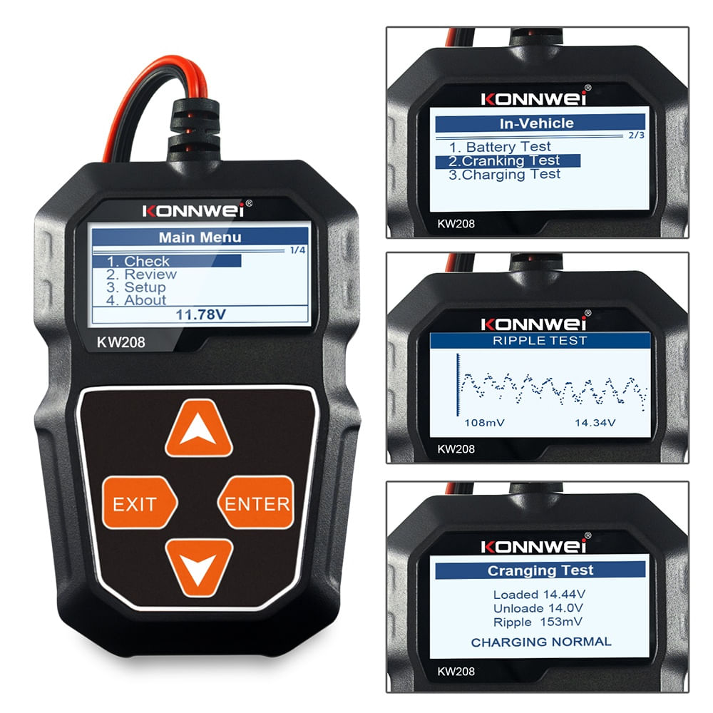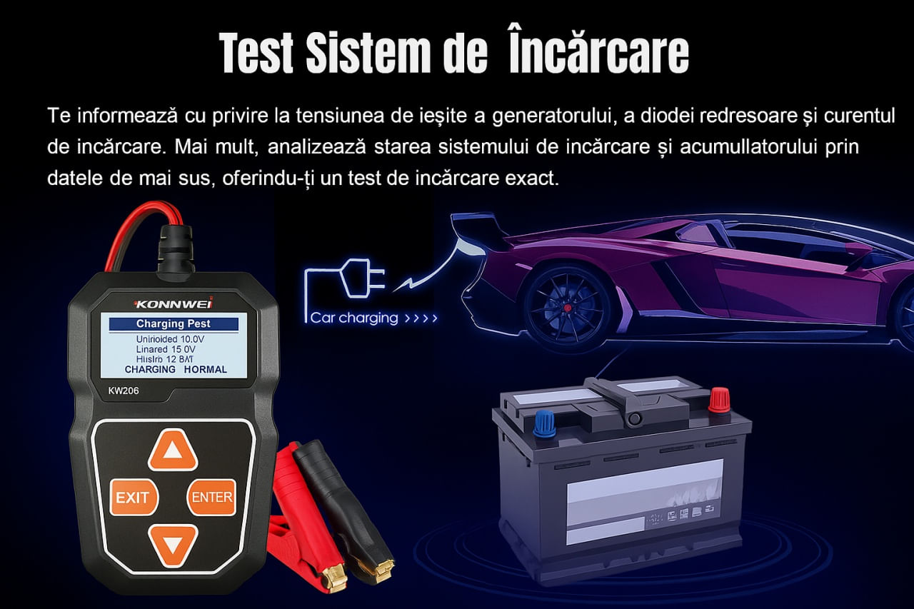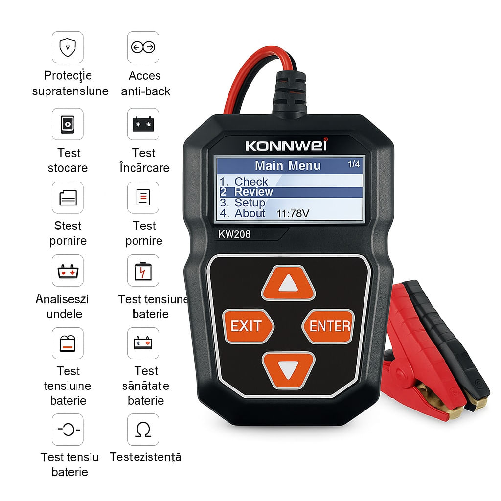 _x000D_Tester de baterie auto KONNWEI KW208 – pentru diagnoza rapida si precisa a acumulatorilor 12V_x000D_KONNWEI KW208 este un tester digital pentru baterii auto de 12V, conceput pentru a verifica starea de sanatate a bateriei, sistemul de pornire (cranking), alternatorul si sistemul de incarcare. Este ideal pentru ateliere auto, mecanici independenti, dar si pentru soferii care vor sa evite surprizele neplacute la drum._x000D_✔ Compatibil cu multiple tipuri de baterii: baterii acide normale, AGM (flat plate si spiral), GEL, EFB si chiar LiFePO4✔ Teste efectuate:_x000D__x000D__x000D_Test baterie (capacitate, CCA, SOH, SOC, rezistenta interna)_x000D__x000D__x000D_Test pornire (cranking voltage & time)_x000D__x000D__x000D_Test incarcare (alternator, dioda redresor, tensiune de incarcare)✔ Detectare rapida a defectelor comune din sistemul de pornire si incarcare, cu instructiuni clare pe ecran_x000D__x000D__x000D_Detalii tehnice:_x000D__x000D__x000D_Tensiune de lucru: DC 9V–16V_x000D__x000D__x000D_Dimensiuni: 12.2 cm x 8 cm x 1.5 cm_x000D__x000D__x000D_Ecran LCD alb-negru de 2.0 inch_x000D__x000D__x000D_Interfata usor de utilizat, cu butoane pentru navigare rapida_x000D__x000D__x000D_Limbi disponibile: Engleza, Germana, Franceza, Spaniola, Italiana, Portugheza, Rusa, Olandeza (suporta si altele la cerere)_x000D__x000D__x000D_Utilizare intuitiva:_x000D__x000D__x000D_Conectezi clemele la bornele bateriei_x000D__x000D__x000D_Alegi tipul bateriei si standardul de masurare (CCA, DIN, IEC etc.)_x000D__x000D__x000D_Efectuezi testul si vezi instant rezultatele: starea bateriei, recomandari (de ex. GOOD-RECHARGE)_x000D__x000D__x000D_Ideal pentru autoturisme, camionete, motociclete sau barci echipate cu baterii de 12V._x000D__x000D__x000D__x000D__x000D_