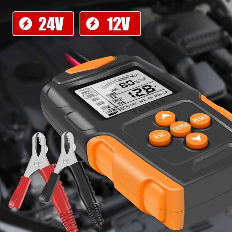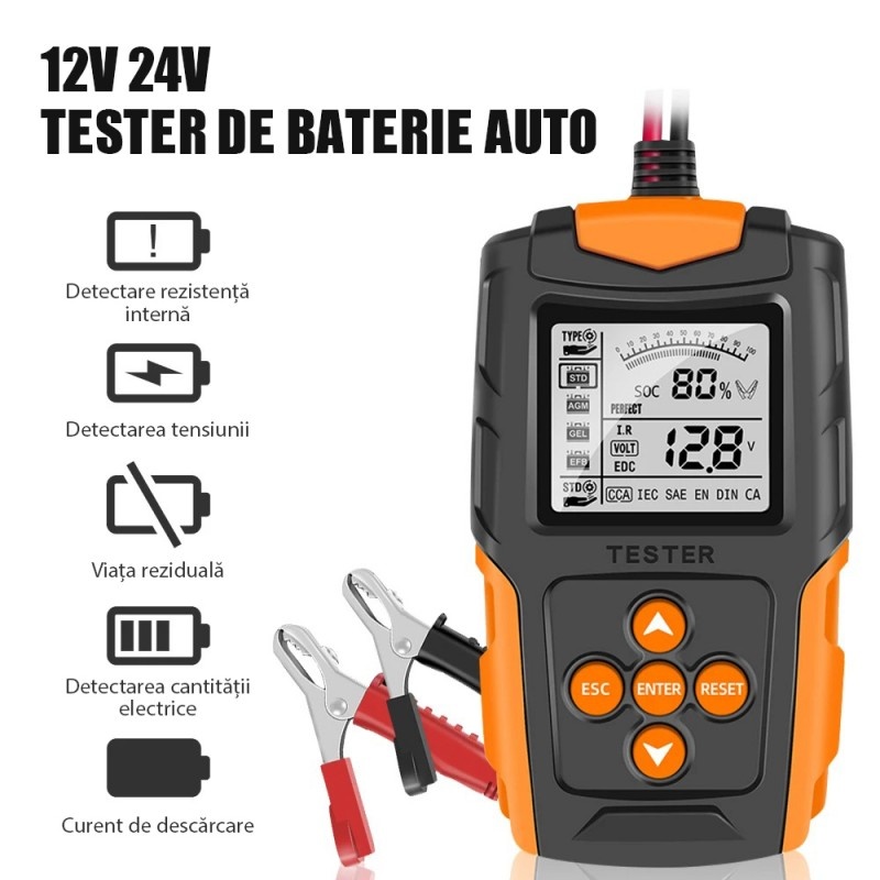 Testerul de baterie auto Techstar® FBT-200 12V/24V este un instrument esențial pentru evaluarea sănătății bateriilor vehiculelor. Cu o gamă largă de compatibilitate, de la mașini la camioane, motociclete, SUV-uri și chiar bărci, acest analizor digital măsoară între 100 și 2000 CCA și poate testa baterii cu capacități cuprinse între 3Ah și 200Ah. Fiind versatil și precis, îți oferă informații valoroase despre starea bateriei, ajutându-te să eviți surprize neplăcute și să menții vehiculul în funcțiune optimă. Afisare extinsa a datelor bateriei: Analizorul de baterii aplica ultima metoda de conductivitate pentru a masura bateria si va ofera un rezultat precis al testului. Include test de rezistenta interna, test de tensiune, starea de sanatate (SOH), starea de incarcare (SOC) si testul valorii CCA. Rapid si cu o precizie > 99,6%: Cu microprocesorul inteligent integrat care face ca testele sa fie rapide si precise, in comparatie cu cele de la Midtronics din SUA. Rata de precizie este de pana la 99,5%. In acelasi timp, rezultatele testului pot fi afisate in doua secunde. Conectare usoara: Analizorul de incarcare a bateriei va permite sa testati bateriile atat in masina, cat si in afara acesteia, chiar si sa testati bateriile moarte. Pur si simplu conectati clemele testerului la baterie si apoi se va aprinde si va fi gata sa testeze si sa analizeze bateria. Este atat de simplu! Siguranta si protectie: Proiectat cu protectie impotriva conexiunii inverse a polaritatii. Daca bornele pozitive si negative sunt inversate, dispozitivul nu va fi deteriorat si nu va afecta masina sau bateria. Specificatii: Nume: Tester baterie auto Nr. articol: FBT200 Tip: digital Interval de măsurare curent: 999 (A) Precizia de măsurare a curentului: 0,1 (A) Interval de măsurare a tensiunii: 8-30 (V) Precizia de măsurare a tensiunii: 0,1 (V) Interval de măsurare a rezistenței interne: 0-999 (mΩ) Precizie de măsurare a rezistenței interne: 0,1 (mΩ) Tensiune de alimentare: 12-24V (V) Putere: 0,5 (W) Interval de testare: 3AH - 200Ah Rezultatul testului: SOH, SOC, CCA Value, IR, etc. Standarde de testare: SAE, DIN, IEC, EN, CA, JIS Interval de măsurare a tensiunii: 8-30VDC Material carcasa: plastic ABS Ecran: LCD de 2,7. Atingerea cablului: 650 mm (25,6 inchi) Temperatura de depozitare: -20C până la +70C (-4F până la 158F) Temperatura de lucru: -20C la +60C (-4F la 140F) Pachetul include: 1 X Tester baterie auto 1 X Manual instructiuni 1 X Husa neagra.