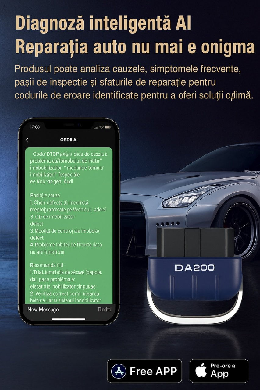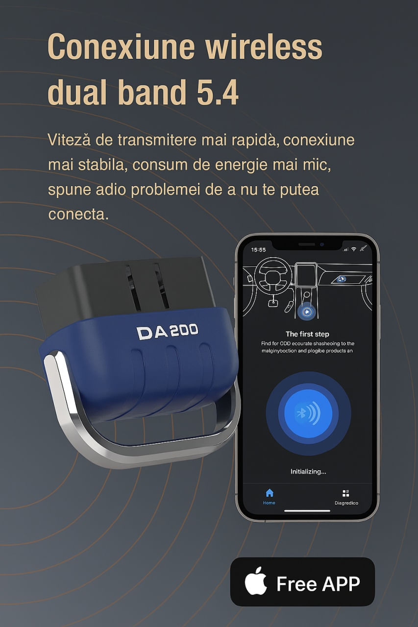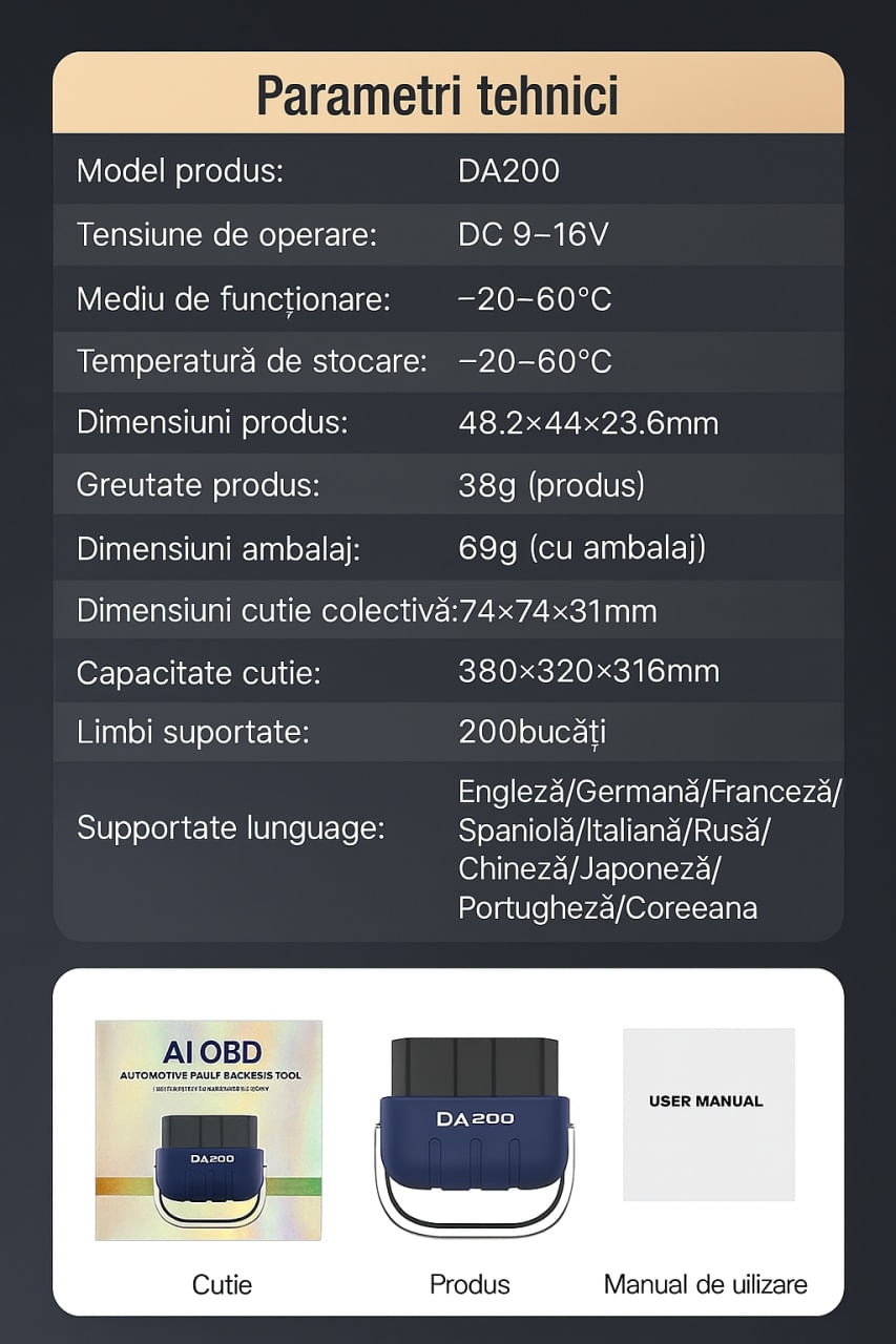 _x000D_Techstar DA200 – Dispozitiv de diagnoza auto OBD2 inteligent, cu Bluetooth 5.4 si cip performant 25K80_x000D_Techstar DA200 este un tester auto OBD2 de ultima generatie, echipat cu cip performant 25K80 si conexiune wireless dual band 5.4 pentru stabilitate superioara si consum redus de energie. Dispozitivul ofera functii multiple de diagnosticare pentru majoritatea masinilor compatibile OBD2, afisand datele in timp real direct pe telefonul mobil prin aplicatia dedicata (disponibila gratuit pe Android si iOS)._x000D_Caracteristici principale:_x000D_✔ Cip 25K80 de inalta performanta – viteza de procesare crescuta cu 1.3x si consum redus cu 1.4x✔ Conexiune Bluetooth 5.4 dual band – mai rapid, mai stabil, mai eficient✔ Bord inteligent – transforma telefonul in tabloul de bord digital in doar cateva secunde✔ Citire si stergere coduri eroare – identifica rapid defectiunile motorului si aprinderea martorilor✔ Flux de date in timp real – afiseaza parametri precum turatie motor (RPM), viteza, sarcina motor, temperatura lichidului de racire, presiune combustibil etc.✔ Analiza calatoriilor – afiseaza consumul total, media consumului, distanta parcursa, franari de urgenta si accelerari rapide✔ Testare senzori – inclusiv senzor oxigen, modul 06, status MIL si alti parametri esentiali✔ Detectare tensiune baterie – monitorizeaza starea acumulatorului✔ Informatii VIN si protocol OBD-II complet✔ Design compact, cu inel metalic pentru introducere si extragere usoara✔ Suport pentru 10 limbi, engleza, germana, franceza, italiana, spaniola, rusa, chineza, japoneza, portugheza_x000D_Compatibilitate extinsa:Functioneaza cu majoritatea masinilor fabricate dupa anul 2000 care respecta standardul OBD2, inclusiv marci precum Audi, BMW, Volkswagen, Ford, Opel, Renault, Toyota, Mercedes-Benz, Hyundai, Kia, Dacia, si altele._x000D_Continut pachet:_x000D__x000D__x000D_1x dispozitiv DA200_x000D__x000D__x000D_1x cutie de prezentare_x000D__x000D__x000D_1x manual de utilizare_x000D__x000D__x000D__x000D__x000D__x000D_