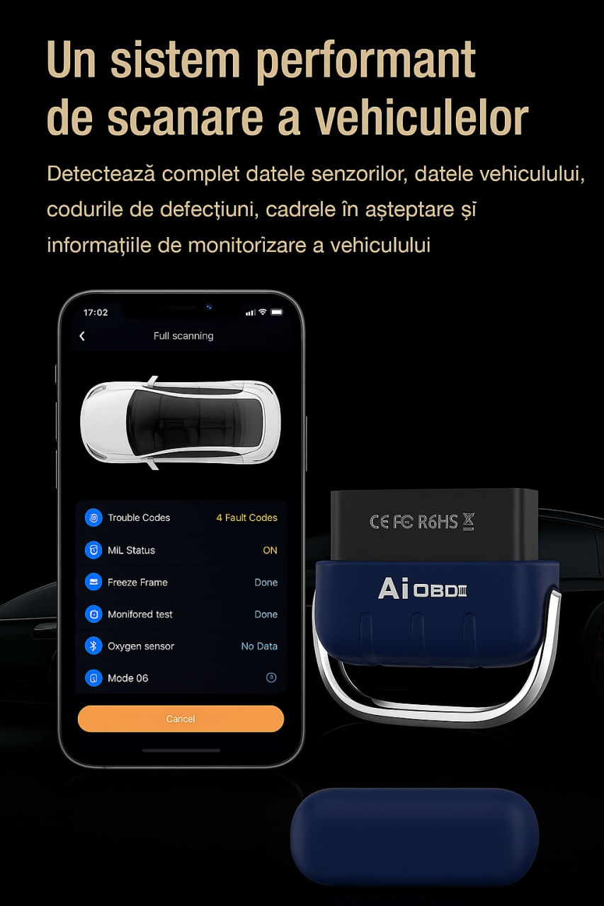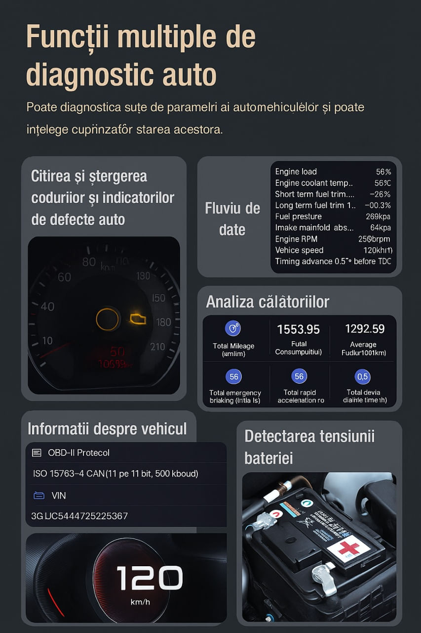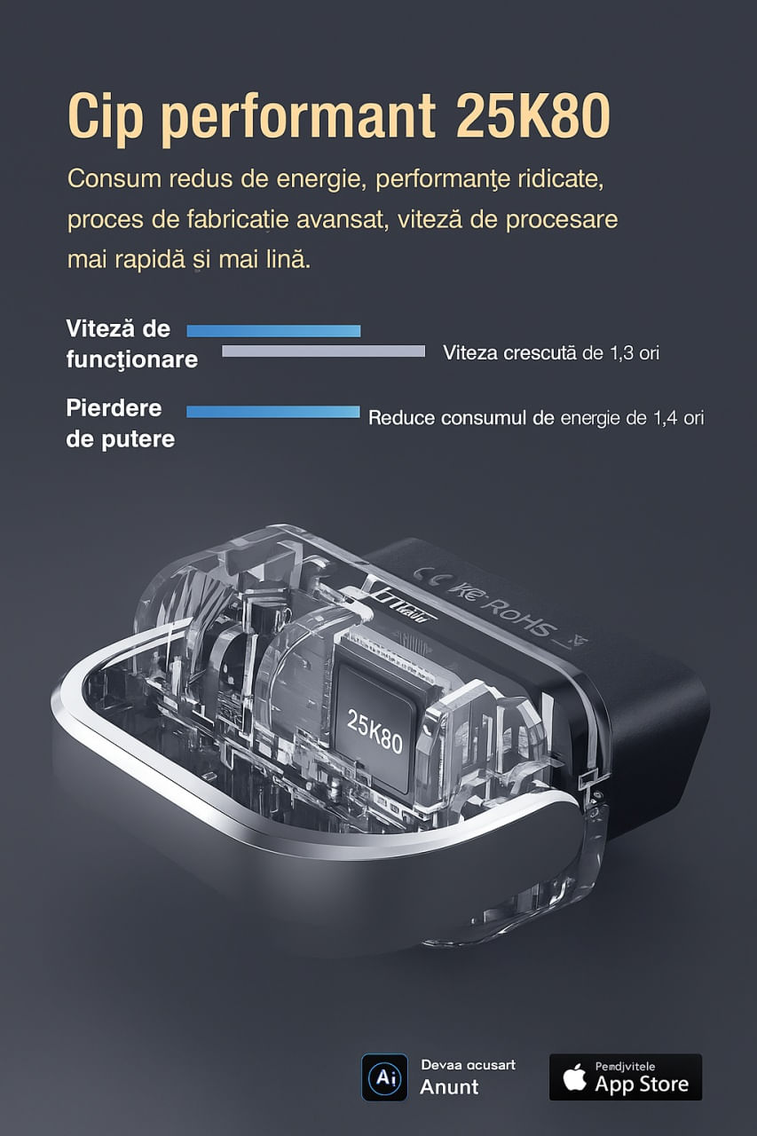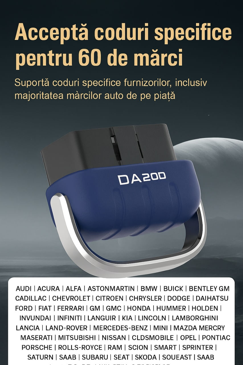 _x000D_Techstar DA200 – Dispozitiv de diagnoza auto OBD2 inteligent, cu Bluetooth 5.4 si cip performant 25K80_x000D_Techstar DA200 este un tester auto OBD2 de ultima generatie, echipat cu cip performant 25K80 si conexiune wireless dual band 5.4 pentru stabilitate superioara si consum redus de energie. Dispozitivul ofera functii multiple de diagnosticare pentru majoritatea masinilor compatibile OBD2, afisand datele in timp real direct pe telefonul mobil prin aplicatia dedicata (disponibila gratuit pe Android si iOS)._x000D_Caracteristici principale:_x000D_✔ Cip 25K80 de inalta performanta – viteza de procesare crescuta cu 1.3x si consum redus cu 1.4x✔ Conexiune Bluetooth 5.4 dual band – mai rapid, mai stabil, mai eficient✔ Bord inteligent – transforma telefonul in tabloul de bord digital in doar cateva secunde✔ Citire si stergere coduri eroare – identifica rapid defectiunile motorului si aprinderea martorilor✔ Flux de date in timp real – afiseaza parametri precum turatie motor (RPM), viteza, sarcina motor, temperatura lichidului de racire, presiune combustibil etc.✔ Analiza calatoriilor – afiseaza consumul total, media consumului, distanta parcursa, franari de urgenta si accelerari rapide✔ Testare senzori – inclusiv senzor oxigen, modul 06, status MIL si alti parametri esentiali✔ Detectare tensiune baterie – monitorizeaza starea acumulatorului✔ Informatii VIN si protocol OBD-II complet✔ Design compact, cu inel metalic pentru introducere si extragere usoara✔ Suport pentru 10 limbi, engleza, germana, franceza, italiana, spaniola, rusa, chineza, japoneza, portugheza_x000D_Compatibilitate extinsa:Functioneaza cu majoritatea masinilor fabricate dupa anul 2000 care respecta standardul OBD2, inclusiv marci precum Audi, BMW, Volkswagen, Ford, Opel, Renault, Toyota, Mercedes-Benz, Hyundai, Kia, Dacia, si altele._x000D_Continut pachet:_x000D__x000D__x000D_1x dispozitiv DA200_x000D__x000D__x000D_1x cutie de prezentare_x000D__x000D__x000D_1x manual de utilizare_x000D__x000D__x000D__x000D__x000D__x000D_