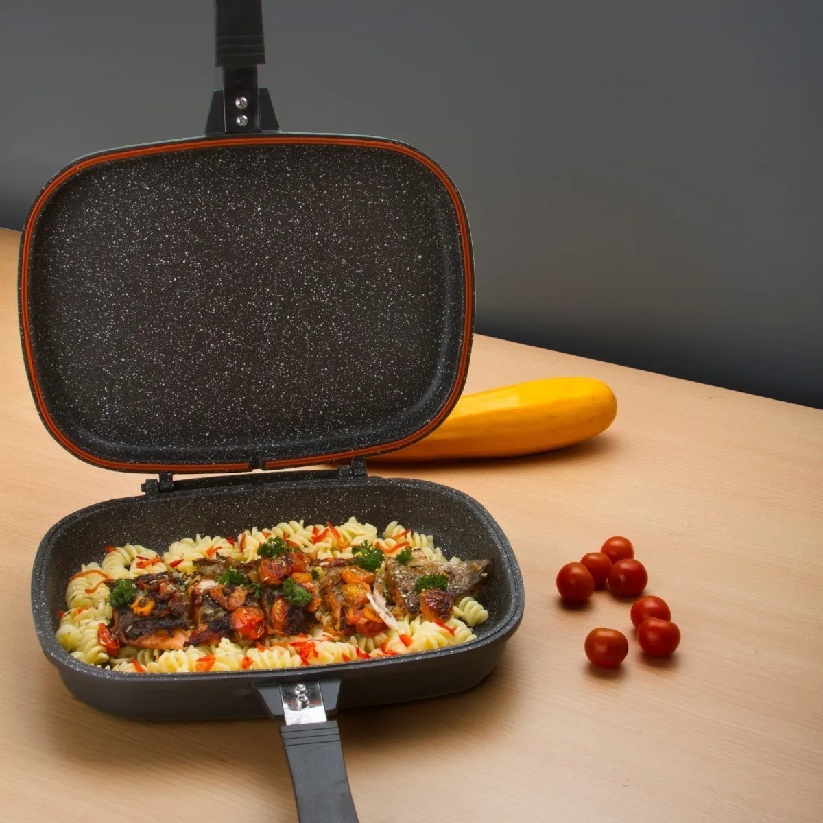 Tigaie Grill Dubla 32 cm Garnitura din silicon si maner magnetic Tigaia este fabricata din aluminiu turnat sub presiune pentru o durata de functionare indelungata. Manerele fabricate din bachelita prevazute cu magneti pentru o mai buna etansare. Caldura distribuita in mod egal datorita garniturii siliconice etanseaza tigaia. Puteti gati in ea carne de pui, peste, carne rosie (vaca, porc, oaie etc.), oua si puteti tot odata sa faceti si cartofi prajiti. Daca intoarceti tigaia pe partea cu striatii veti putea face gratare minunate fara fum in bucatarie.Toate acestea le puteti gati fara sau cu cateva picaturi de ulei. Pachetul contine garnitura din silicon de rezerva. Caracteristici: dimensiune tigaie 32×22 cm, adancime 4.5 cm x 2 rezistenta la temperaturi ridicate cele doua parti ale tigaii sunt detasabile si se poate folosi si separat aluminiul turnat mentine caldura mai mult timp manere magnetice ideala pentru a prepara alimentele sanatoase si delicioase poate si folosit foarte putin ulei si fara a lasa miros se curata foarte usor si este prevazuta cu o garnitura pentru inchidere etansa Instructiuni de intretinere: Inainte de prima utilizare, spalati produsul cu apa si detergent. Evitati socurile termice si mecanice. Poate fi folosita pe toate tipurile de plite exceptand inductia. Se pot spala si la masina de spalat vase. Toate produsele noastre beneficiaza de verificare inainte de a fi livrate catre client.