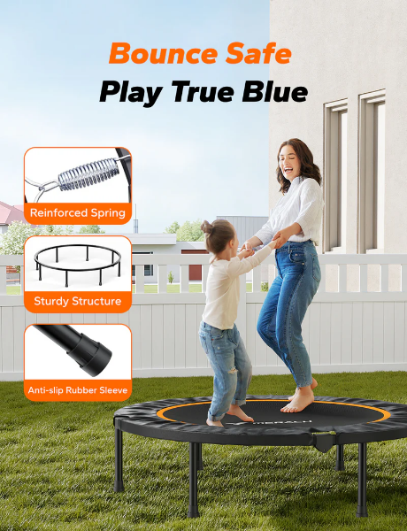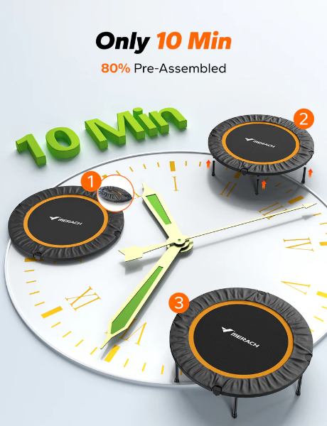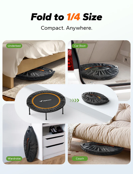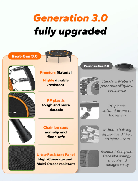Cadru robust din oțel pentru antrenament - Mini trambulina MERACH, fabricată din oțel industrial cu conexiuni triplu sudate, poate suporta o greutate de până la 150 kg. Rezistă la activități intense în familie și absoarbe șocurile pentru o funcționare silențioasă (≤ 20dB). Ideală pentru acasă, antrenament HIIT și cardio dans fără a deranja vecinii.Tehnologie Silent Bounce și protecție antiderapantă - Sistemul exclusiv de rebound cu 3 straturi al trambulinei de fitness MERACH, capacele antiderapante TPE pentru picioare se stabilizează pe parchet/gresie, pernele din spumă care absorb șocurile distribuie 87% din forța de impact, iar covorul de sărituri țesut împiedică alunecarea picioarelor. Ardeți calorii ca la sală, în liniște, pe canapea - perfect pentru case sau studiouri.PLIABILĂ ȘI ECONOMISITOARE DE SPAȚIU - Când nu aveți nevoie să utilizați sau să transportați trambulina de fitness pentru adulți, aceasta poate fi pliată cu ușurință în câțiva pași simpli. Când este pliată, poate fi depozitată convenabil într-un colț, în portbagajul mașinii sau lângă un dulap, cu condiția să existe suficient spațiu pentru depozitare când este pliată. Asamblarea acestei mici trambuline este o joacă de copii și durează doar câteva minute. Trambulină mini pentru acasă Upgrade 3.0 - Trambulina de interior MERACH are o structură din oțel rezistentă, pentru o durabilitate îndelungată. Capetele antiderapante și stabilizatoare ale picioarelor asigură o stabilitate sigură pe diferite suprafețe și, astfel, vă garantează siguranța. Cusăturile întărite ale plăcii de sărituri de înaltă performanță și materialele textile rezistente asigură o săritură sigură în timpul antrenamentului. MERACH oferă performanțe fiabile și îndeplinește standarde stricte de siguranță pentru fitnessul în familie.