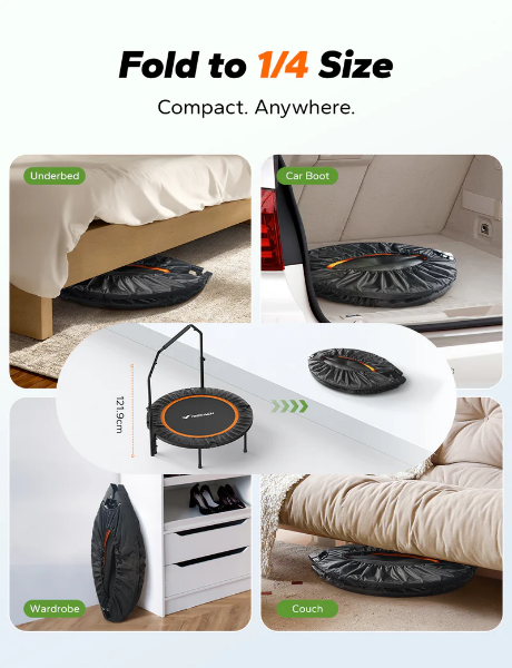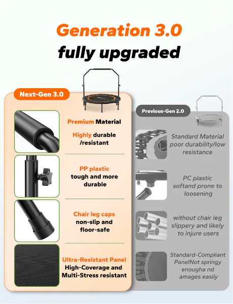 Cadru robust din oțel pentru antrenament - Mini trambulina MERACH, fabricată din oțel industrial cu conexiuni triplu sudate, poate suporta o greutate de până la 150 kg. Rezistă la activități intense în familie și absoarbe șocurile pentru o funcționare silențioasă (≤ 20dB). Ideală pentru acasă, antrenament HIIT și cardio dans fără a deranja vecinii.Tehnologie Silent Bounce și protecție antiderapantă - Sistemul exclusiv de rebound cu 3 straturi al trambulinei de fitness MERACH, capacele antiderapante TPE pentru picioare se stabilizează pe parchet/gresie, pernele din spumă care absorb șocurile distribuie 87% din forța de impact, iar covorul de sărituri țesut împiedică alunecarea picioarelor. Ardeți calorii ca la sală, în liniște, pe canapea - perfect pentru case sau studiouri.PLIABILĂ ȘI ECONOMISITOARE DE SPAȚIU - Când nu aveți nevoie să utilizați sau să transportați trambulina de fitness pentru adulți, aceasta poate fi pliată cu ușurință în câțiva pași simpli. Când este pliată, poate fi depozitată convenabil într-un colț, în portbagajul mașinii sau lângă un dulap, cu condiția să existe suficient spațiu pentru depozitare când este pliată. Asamblarea acestei mici trambuline este o joacă de copii și durează doar câteva minute. Trambulină mini pentru acasă Upgrade 3.0 - Trambulina de interior MERACH are o structură din oțel rezistentă, pentru o durabilitate îndelungată. Capetele antiderapante și stabilizatoare ale picioarelor asigură o stabilitate sigură pe diferite suprafețe și, astfel, vă garantează siguranța. Cusăturile întărite ale plăcii de sărituri de înaltă performanță și materialele textile rezistente asigură o săritură sigură în timpul antrenamentului. MERACH oferă performanțe fiabile și îndeplinește standarde stricte de siguranță pentru fitnessul în familie.