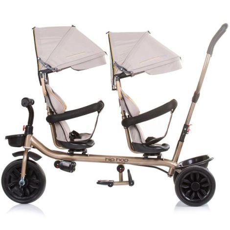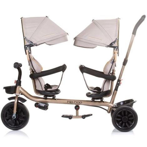 Detalii Tricicleta gemeni Chipolino Hip HopCaracteristici:Potrivita pentru doi copii cu varsta peste 1,5 ani, cu o greutate totala de pana la 40 kgPoate fi pusa in miscare de catre copil cu ajutorul pedalelor sau poate fi impins de catre parinteAmbele sezuturi sunt rotative cu o rotatie de 360 gradeAmbele sezuturi sunt dotate cu bara de protectieManer de dirijare confortabilDoua suporturi pentru picioare reglabile, pliabileAparatoare noroi la roata din fataCopertine mari, reglabile pe ambele sezuturi, cu vizoareDoua sezuturi mari, confortabile cu husaCentura de siguranta la ambele sezuturiCosuri de depozitare in fata si in spateRoata fata cu capac ce previne prinderea accidentala a picioarelor copiluluiFabricat in conformitate cu standardele si directivele uniunii europene pentru siguranta jucariilorDimensiuni produs (LxWxH): 131 x 49 x 95 cmDimensiuni ambalaj (LxWxH): 110 x 44 x 30 cmGreutate neta: 9,40 kgGreutate bruta: 11,00 kgAVERTISMENTE!A se utiliza cu echipament de protectie. A nu se utiliza in trafic.Verificati si intretineti in mod constant partile principale (elemente de sustinere, fixare, ancorare, etc.) pentru evitarea caderii sau a rasturnarii.Contraindicat copiilor mai mici de 3 ani. Jucaria/produsul poate contine piese mici care se pot inghiti sau inhala existand pericolul de sufocare sau nu este potrivita copiilor mai mici de 3 ani. Nu lasati ambalajele jucariilor/produselor la indemana copiilor. Indepartati orice ambalaj al jucariei/produsului inainte de a da jucaria/produsul copilului. Va rugam sa supravegheati copilul in timp ce se joaca/foloseste acest produs. Pastrati instructiunile si etichetele pentru referinte viitoare. Pastrati jucaria/produsul departe de foc; feriti jucaria/produsul de temperaturi ridicate si umiditate.