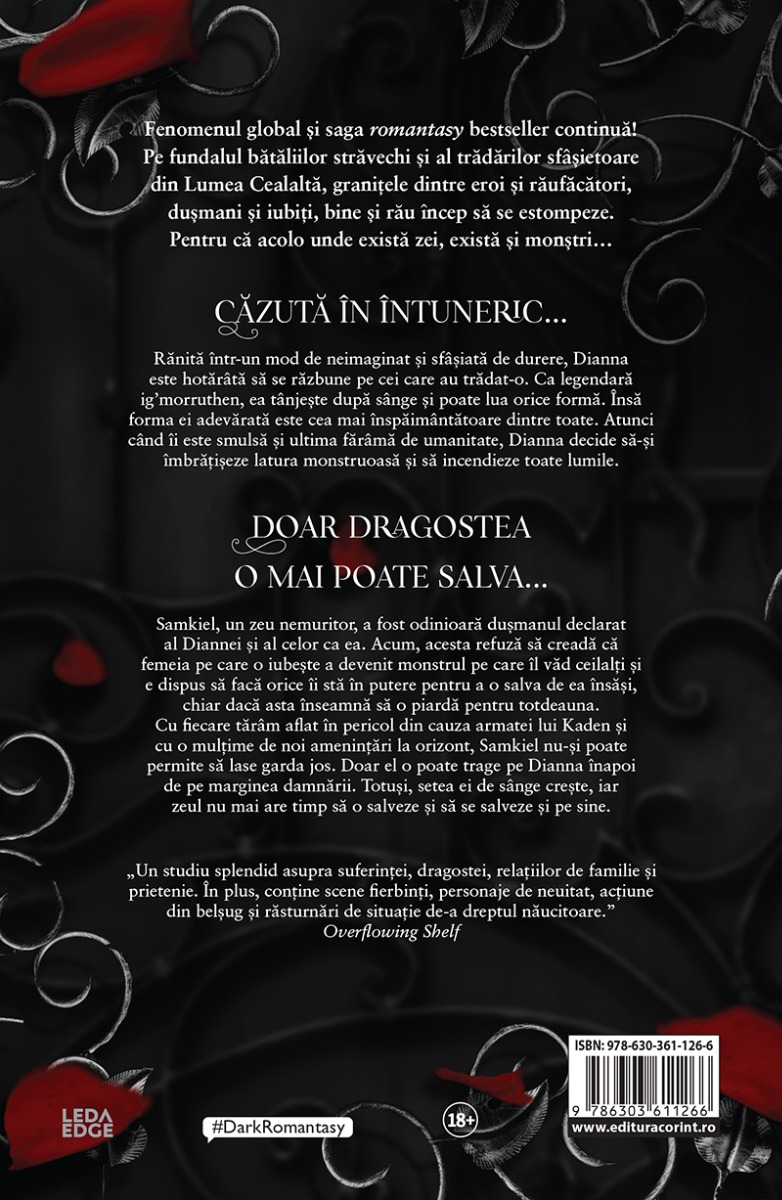#html-body [data-pb-style=EI3X513]{justify-content:flex-start;display:flex;flex-direction:column;background-position:left top;background-size:cover;background-repeat:no-repeat;background-attachment:scroll}Căzută în întuneric…nRănită într-un mod de neimaginat și sfâșiată de durere, Dianna este hotărâtă să se răzbune pe cei care au trădat-o. Ca legendară ig’morruthen, ea tânjește după sânge și poate lua orice formă. Însă forma ei adevărată este cea mai înspăimântătoare dintre toate. Atunci când îi este smulsă și ultima fărâmă de umanitate, Dianna decide să‑și îmbrățișeze latura monstruoasă și să incendieze toate lumile. Doar dragostea o mai poate salva...nSamkiel, un zeu nemuritor, a fost odinioară dușmanul declarat al Diannei și al celor ca ea. Acum, acesta refuză să creadă că femeia pe care o iubește a devenit monstrul pe care îl văd ceilalți și e dispus să facă orice îi stă în putere pentru a o salva de ea însăși, chiar dacă asta înseamnă să o piardă pentru totdeauna. Cu fiecare tărâm aflat în pericol din cauza armatei lui Kaden și cu o mulțime de noi amenințări la orizont, Samkiel nu‑și poate permite să lase garda jos. Doar el o poate trage pe Dianna înapoi de pe marginea damnării. Totuși, setea ei de sânge crește, iar zeul nu mai are timp să o salveze și să se salveze și pe sine. Un studiu splendid asupra suferinței, dragostei, relațiilor de familie și prietenie. În plus, conține scene fierbinți, personaje de neuitat, acțiune din belșug și răsturnări de situație de-a dreptul năucitoare.” - Overflowing Shelf Universul construit continuă să te captiveze și să te seducă pe măsură ce tot mai multe fire ale intrigii se dezvăluie, pagină cu pagină. Practic, privești cu sufletul la gură cum lumi întregi sunt sfâșiate și făcute scrum de Dianna, care le mistuie fără milă, aprinzând fiecare colțișor din ele în numele răzbunării.” - Dear Dominique Tronul zeilor învinși nu este doar o continuare, ci o experiență în sine. O poveste despre răzbunare, iubire și alegerile imposibile care ne definesc. Este o carte despre monștri – atât cei pe care trebuie să îi înfruntăm, cât și cei în care ne transformăm.” - The Art of Reading O lectură de neratat pentru iubitorii de romantasy!” - Miles of Comfort