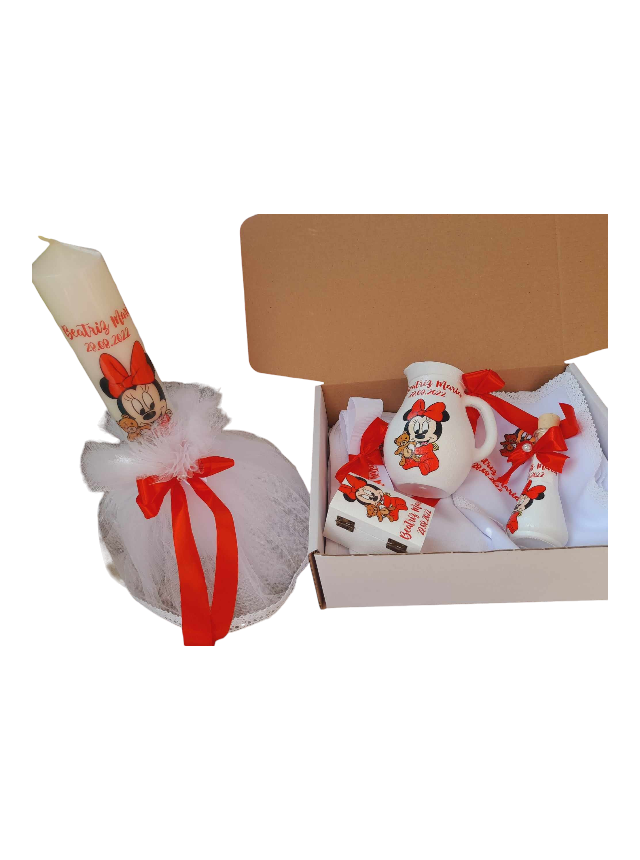 Trusou personalizat Engros pentru botez, in cutie de carton + lumanare Trusoul conține prosop cu capișon prosop preot fașa pânza sticluță carafa ,cutiuță pt par și lumânare