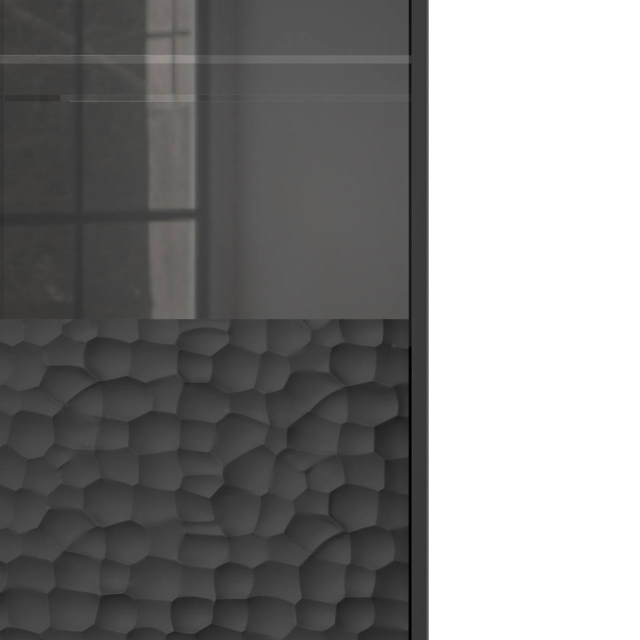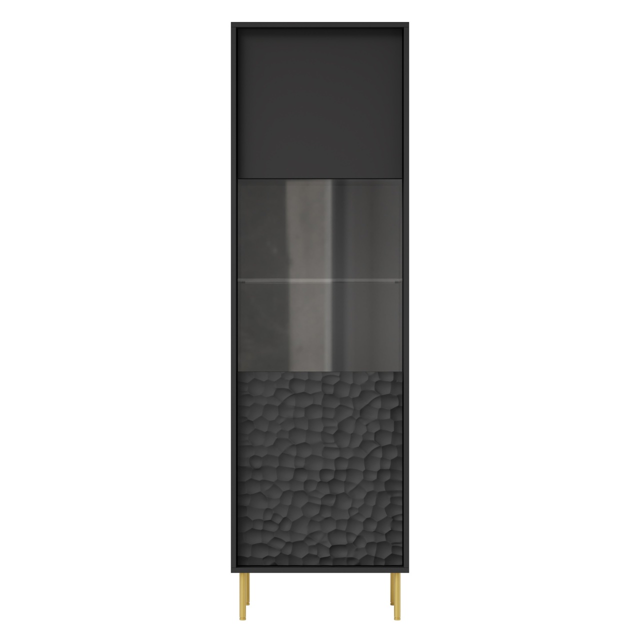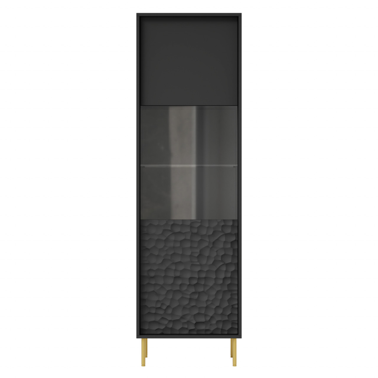 Vitrina Bullet în nuanța de negru cu accente aurii, reprezintă o piesă de mobilier rafinată și elegantă, perfectă pentru a evidenția și a organiza obiectele decorative sau colecțiile voastre într-un mod sofisticat. Cu un design modern și atent lucrat, această vitrină este ideală pentru integrarea într-o varietate de stiluri de interior, de la cele contemporane la cele mai clasice. Este alegerea potrivită pentru cei care doresc să aducă un plus de stil și funcționalitate în spațiul lor locuibil. Dimensiuni: Lățime: 41 cm Lungime: 55 cm Înălțime: 185 cm Detalii tehnice: – materiale: placă de mobilier laminat, MDF furniruit, metal; – designul are formă de adâncituri pe fronturi (fagure); – picioarele sunt realizate din metal, nuanța auriu. Culoare: Negru/auriu Produsul nu este montat, este destinat pentru auto-asamblare. Instrucțiunile de montaj vin în colet.