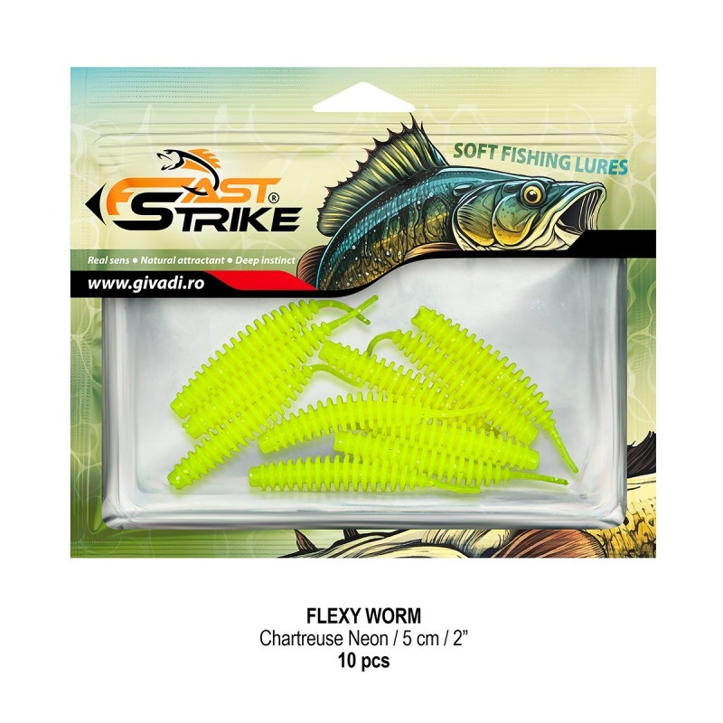 Fast Strike Flexi Worm 5cm, Chartreuse Neon este o nălucă soft extrem de versatilă, concepută pentru pescuitul bibanului, păstrăvului și cleanului , dar foarte eficientă și la șalău și știucă atunci când peștii sunt apatici sau refuză momelile mai mari. Forma segmentată și coada subțire creează vibrații fine și bule de aer în timpul recuperării, imitând perfect un viermișor în mișcare. Materialul moale și elastic din care este realizat asigură o evoluție naturală, chiar și la cele mai mici impulsuri ale lansetei. Datorită culorii Chartreuse Neon , Flexi Worm devine o alegere excelentă pentru ape tulburi sau condiții de lumină scăzută , oferind o vizibilitate crescută și declanșând atacuri reflexe. Poate fi montat pe Drop Shot, Cheburashka, Split Shot sau micro-jiguri , fiind ideal pentru tehnici de finețe. Impregnat cu aromă naturală de peștișor pradă și ambalat în blister rigid cu fermoar , își păstrează forma și calitatea în timp, chiar și după utilizări repetate. Caracteristici: ? Tip nălucă: vierme soft (worm) ? Specii vizate: biban, păstrăv, clean, șalău, știucă ⚙️ Material: silicon moale, elastic și rezistent ? Acțiune: vibrație fină, emisie de bule de aer Monturi compatibile: Drop Shot, Cheburashka, Split Shot, micro-jig ? Aromă: peștișor pradă, impregnată din fabrică ? Lungime: 5 cm ? Culoare: Chartreuse Neon ? Ambalaj: blister rigid cu fermoar, 10 bucăți