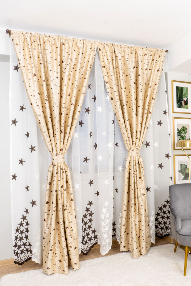Set Amman - Perdea din In cu Stelute Maro Intens si Draperie Blackout Cappuccino cu Stelute