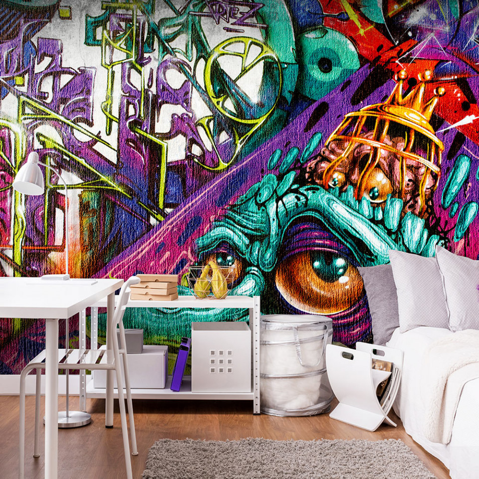 Fototapet - Street art - graffiti colorat în nuanțe de violet cu o figură de goblin