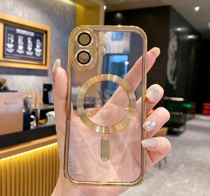 Husa pentru iPhone 16 Plus, Luxe Armor, Magsafe, Protectie camera, Silicon, Transparent, Auriu Engros