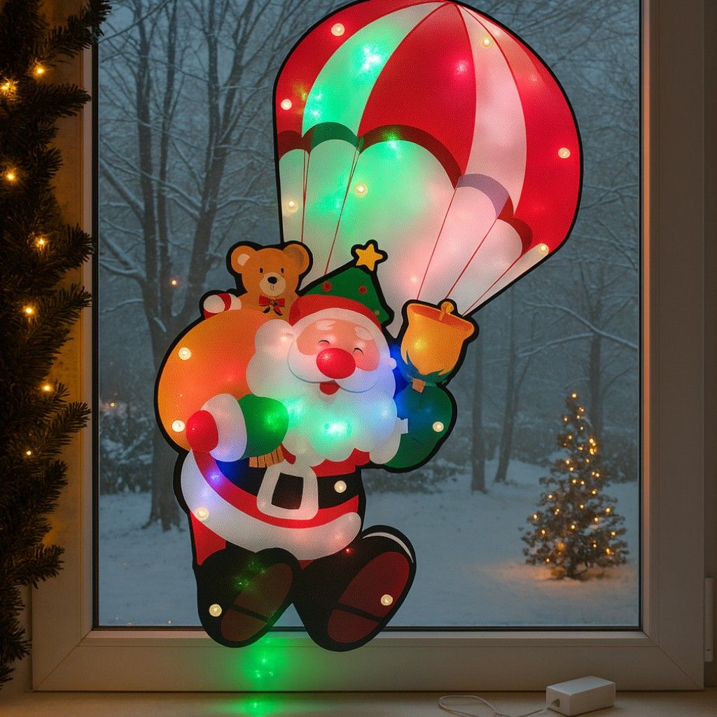 Decorațiune de Geam pentru Crăciun 42x20cm, Mos Craciun cu Parasuta, cu Lumină LED Multicoloră, Model 3D, cu Alimentare la Priză Engros