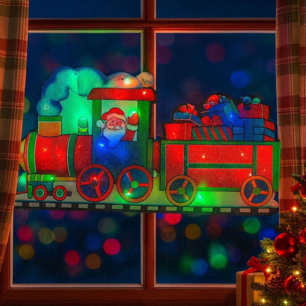 Decorațiune de Geam pentru Crăciun 45x24cm, Mos Craciun in Tren, cu Lumină LED Multicoloră, Model 3D, cu Alimentare la Priză Engros